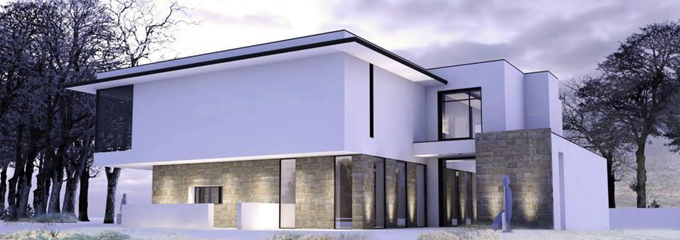 À l'extérieur, la maison présente des lignes géométriques nettes, dominées par des façades blanches et de larges surfaces vitrées. La structure est complétée par des éléments en pierre et des balustrades en métal noir qui ajoutent du caractère et un contraste visuel avec la pureté des murs. Le toit plat souligne le style contemporain, tandis que la végétation environnante semble se fondre naturellement dans le cadre architectural, apportant une touche de nature à cette réalisation moderne et sophistiquée.
